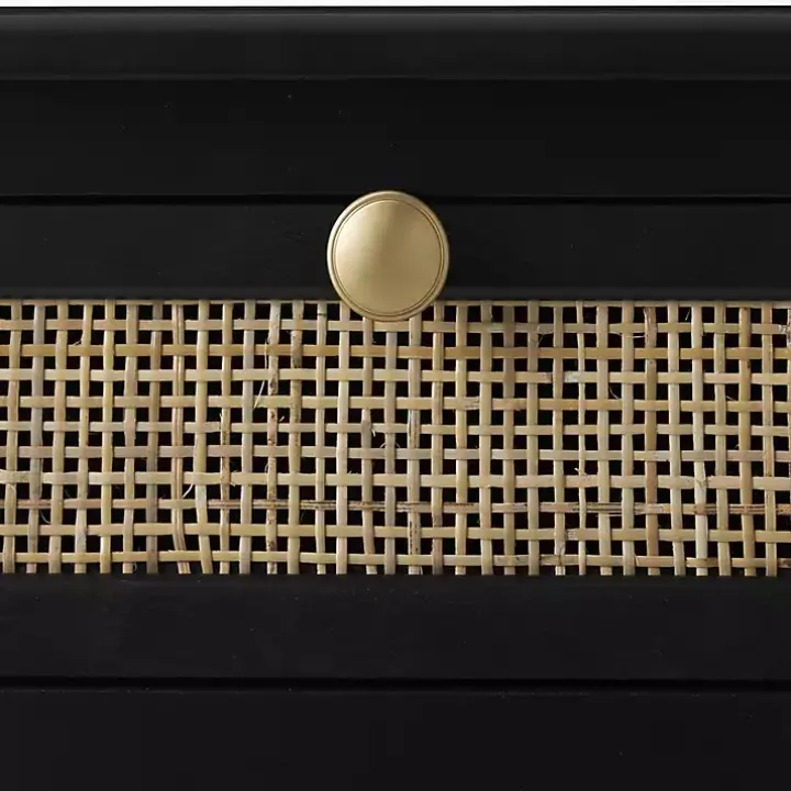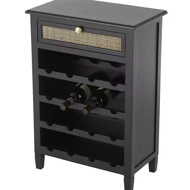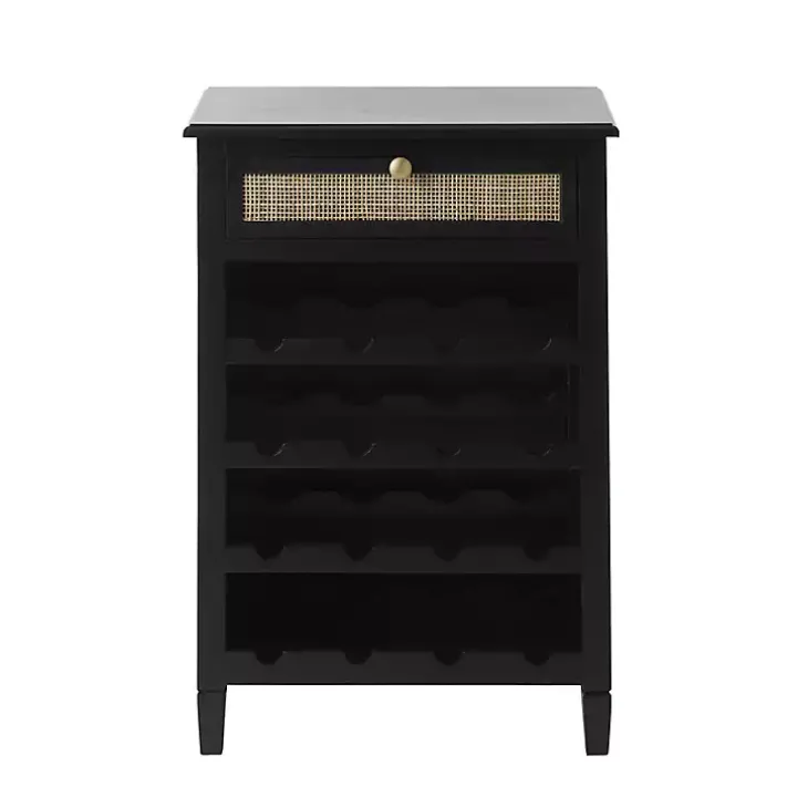 Display your wine collection in style with this Black Wood & Natural Rattan Wine Bottle Cabinet! This chic cabinet also has a pull-out drawer, perfect for storing your bottle openers, coasters, and cocktail napkins!