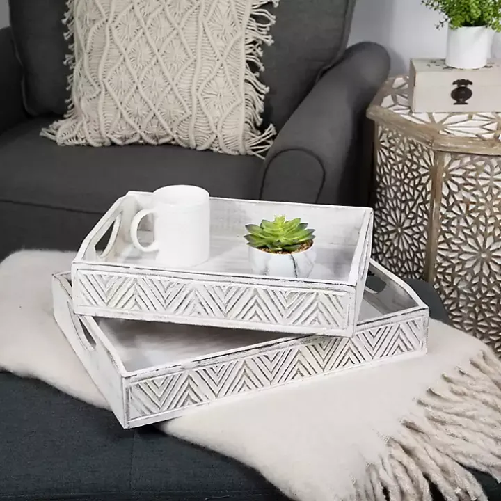 Keep your trinkets and accessories organized with the set of Brushed White Chevron Carved Trays. You’ll love how they lend rustic-boho charm to your home décor.