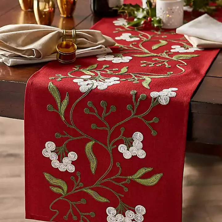 Create a holiday tablescape to remember with this Embroidered Mistletoe Christmas Table Runner. Its rich, intricate embroidery and bold colors will give your dining table a festive, elegant makeover.