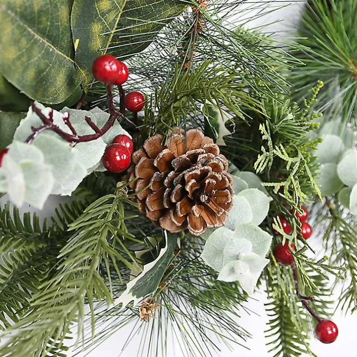 - Features a mix of evergreen branches, pinecones, eucalyptus, leaves, and berries