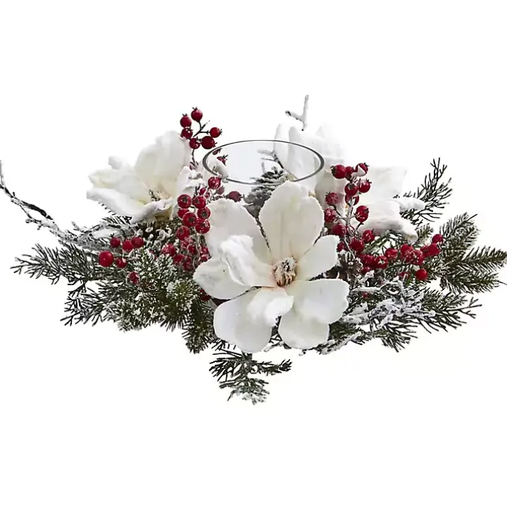 Snowy magnolias are accented with pine cones and berries in this Frosted Magnolia Berry Candle Holder. You’ll love how it looks on your Christmas dinner table.