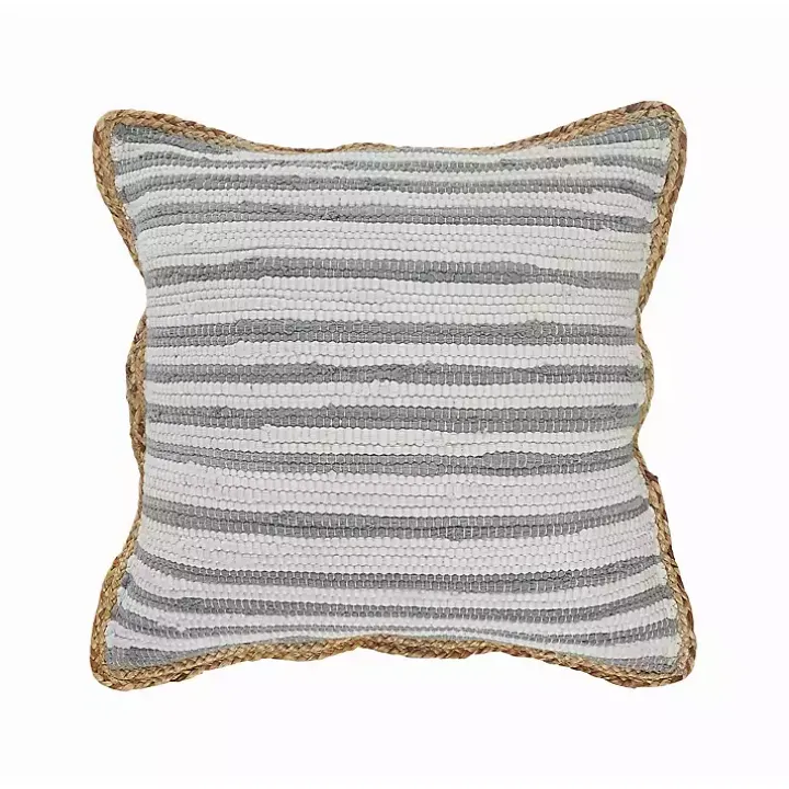 Add a classically cute look to your living space with this Gray and White Stripped Jute Border Accent Pillow. You’ll love its woven design and neutral color palette.