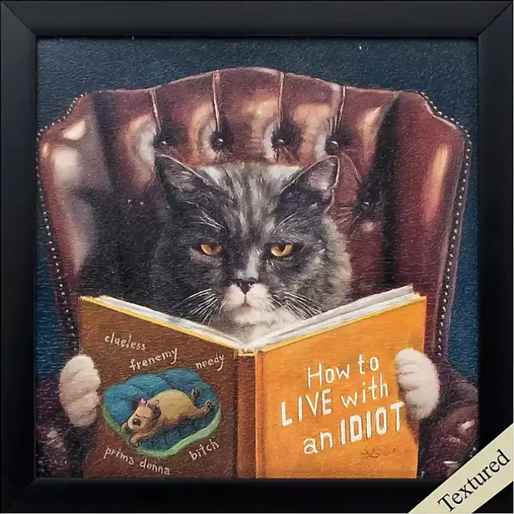 Add some sass to your walls with our Home Improvement Framed Art Print. Featuring a cat reading a book titled How to Live with an Idiot, gift this print to an owner of a cheeky cat.