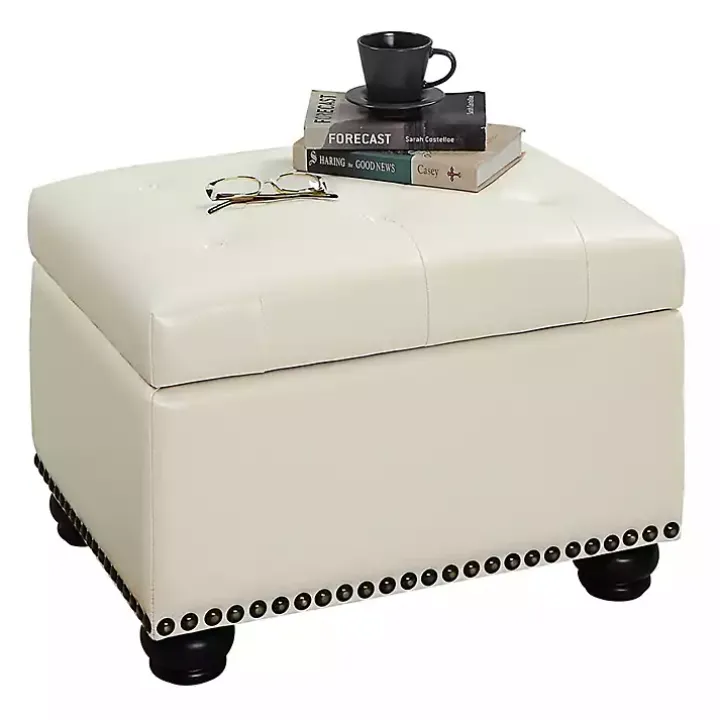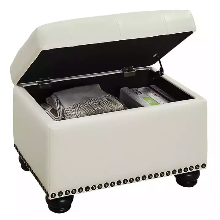 This Ivory Faux Leather Jessy Storage Ottoman makes it easy to organize your space with a stylish touch! With a sophisticated faux leather upholstery and convenient hinged lid, this ottoman can be used for a variety of needs.