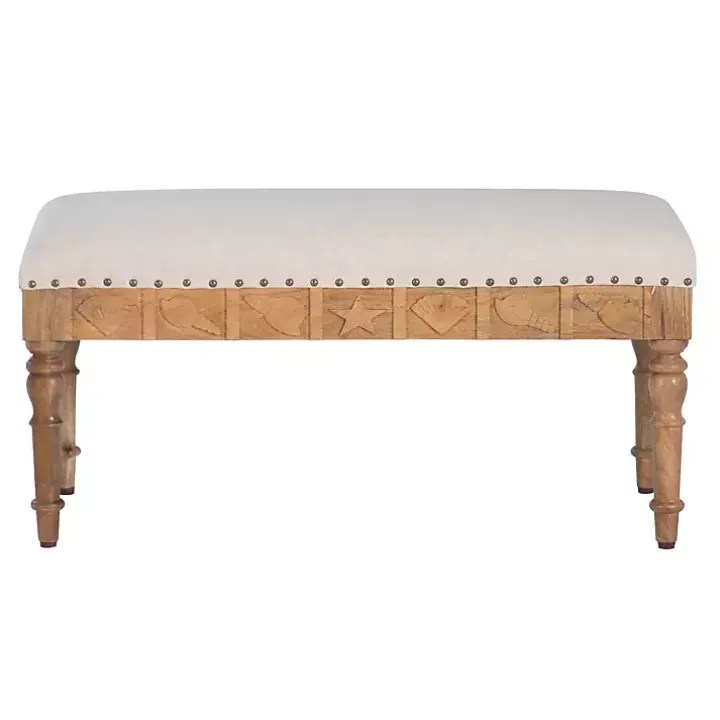 This Ivory Upholstered Seashell Wood Bench is a coastal charmer that brings the beach vibes to your home!Whether in your entryway or bedroom, this small bench offers a cozy coastal retreat.