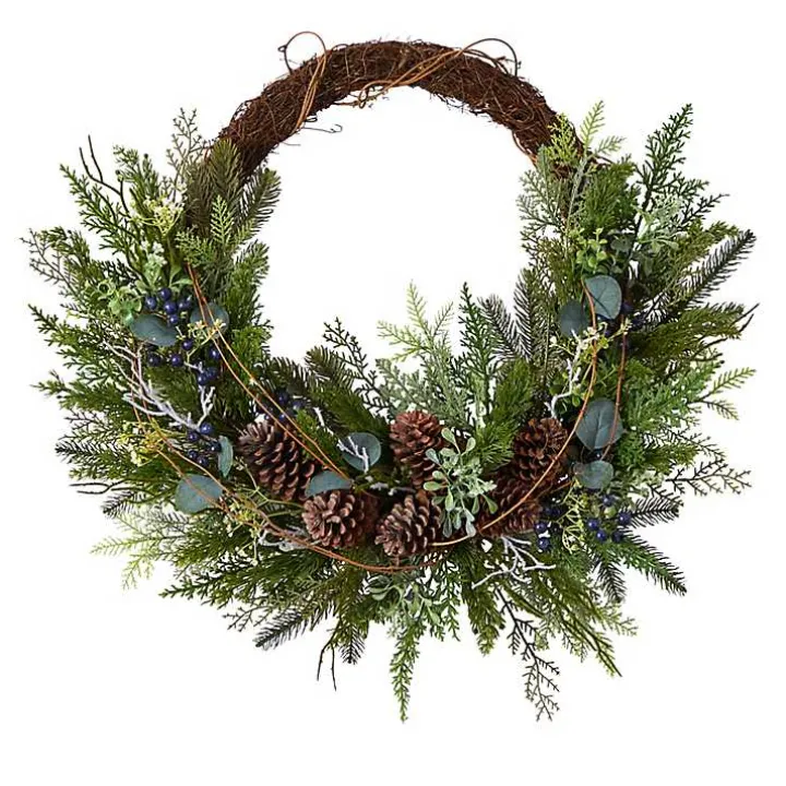 - Features a mix of pine branches, pinecones, twigs, and berries