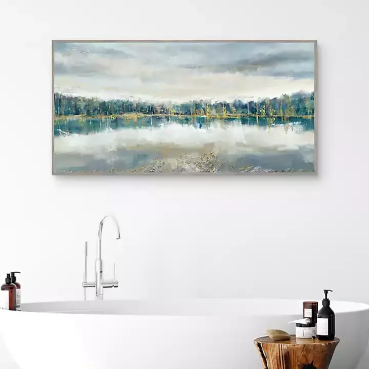 Dense forests rise in the distance along a pristine lake in our Lakeside Luxe Framed Canvas Art Print! This print is perfect for a bedroom or living room.