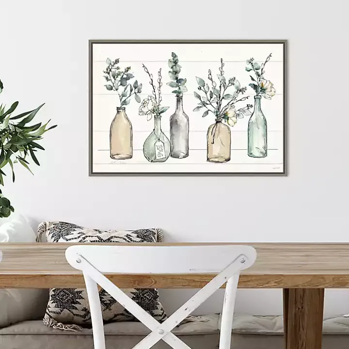 The Modern Farmhouse Floral Framed Canvas Art Print features a row of botanical arrangements on a shiplap style back. It’s the perfect way to make your dining space look fresh and elegant!