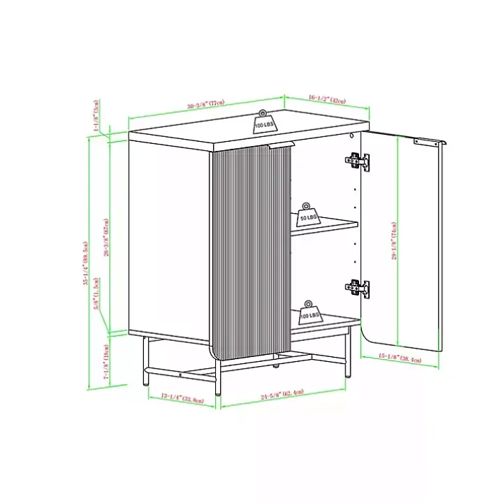 - Cabinet measures 30.4L x 16.5W x 35.3H in.