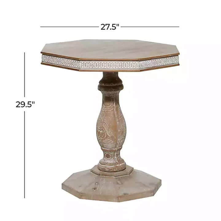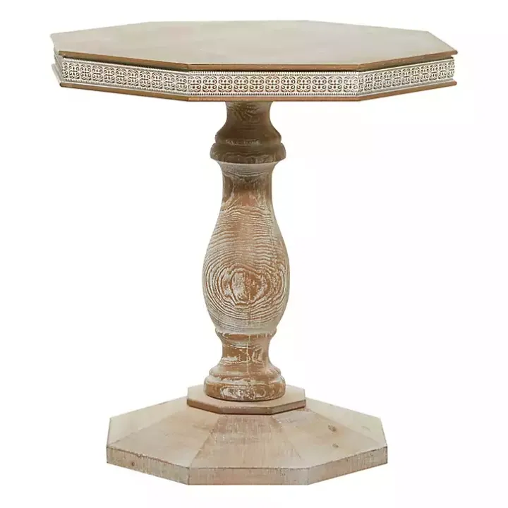 The Natural Rustic Wood Octagon Accent Table features white distressing to highlight the natural wood grain and carved detailing. Supported with a pedestal base, this weathered table embodies classic farmhouse style.