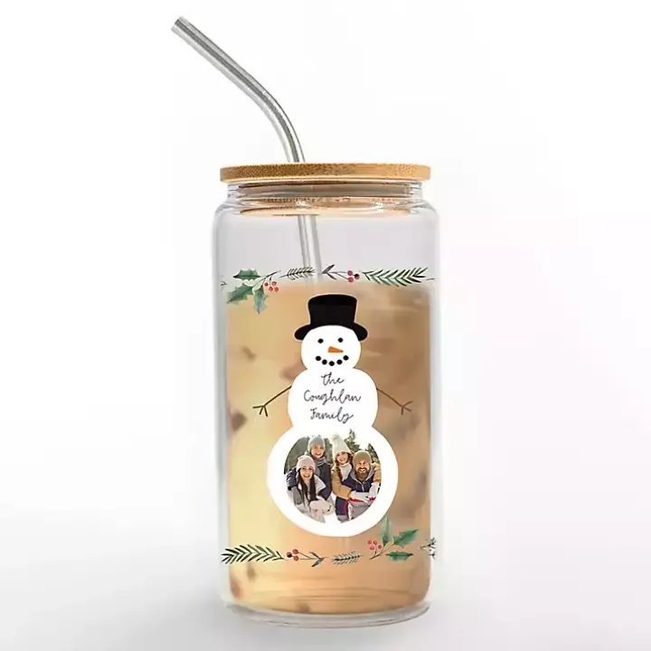 Sip your iced peppermint mocha on the go with this Personalized Snowman Photo Glass Can Cup! This custom cup includes a space to insert your favorite family Christmas photo.