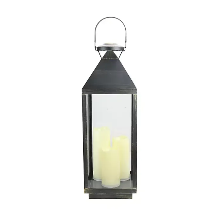 Illuminate your space with this Pre-Lit Gold Brushed Black Candle Lantern! This lantern features large clear panes to light up your home with its LED candles. You’ll love how it brings a warm glow and cozy charm to your home!