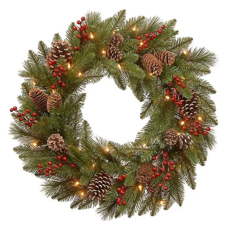 Spruce up your front door with our Pre-Lit Snowy Bristle Spruce Christmas wreath! Its realistic needles, snowy pine cones, and vibrant holly berries make this wreath a Christmas classic.