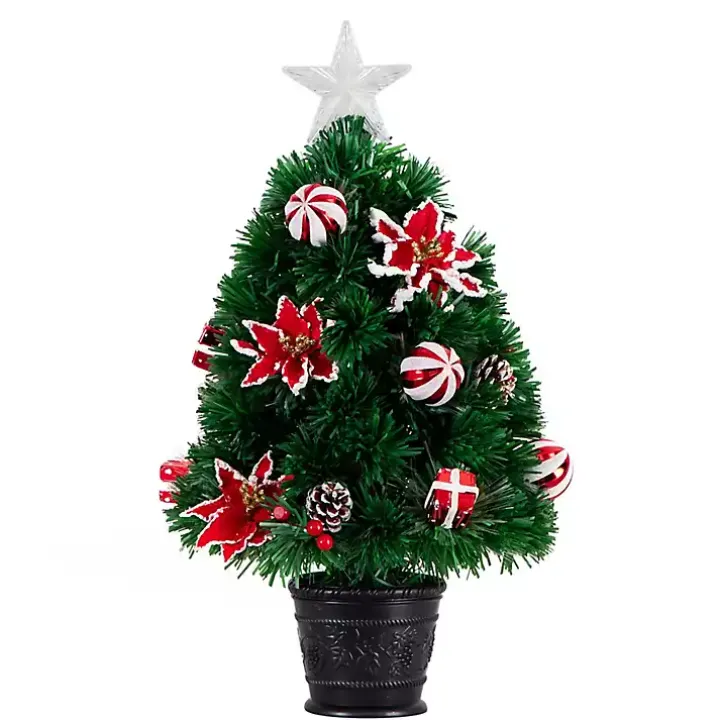 - Accented with poinsettias, ornaments, pinecones, and a star tree topper