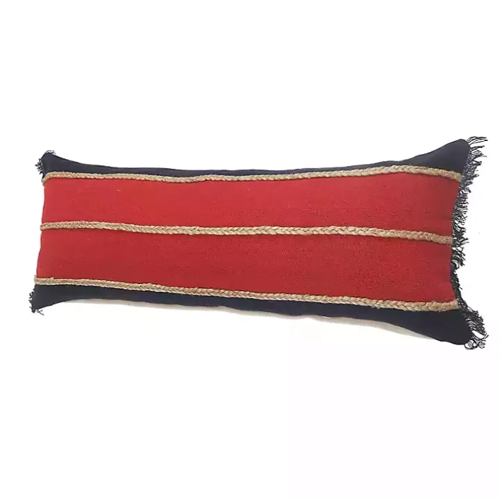 This Red & Navy Nautical Rope Lumbar Pillow features a blue and red striped design and textured jute braiding. It’s a wonderful accent for the nautical or Americana home!