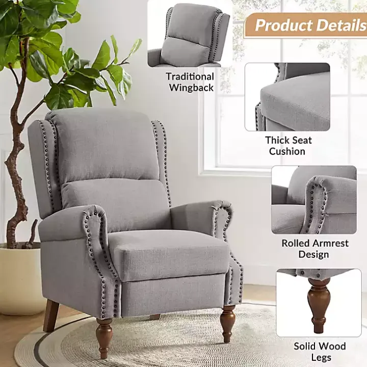 Accent your space with an elegant touch! This Rosalie Light Gray Upholstered Manual Recliner features classic details like rolled armrests, nailhead trim, and spindle wood legs, so you can lay back and relax without sacrificing style.