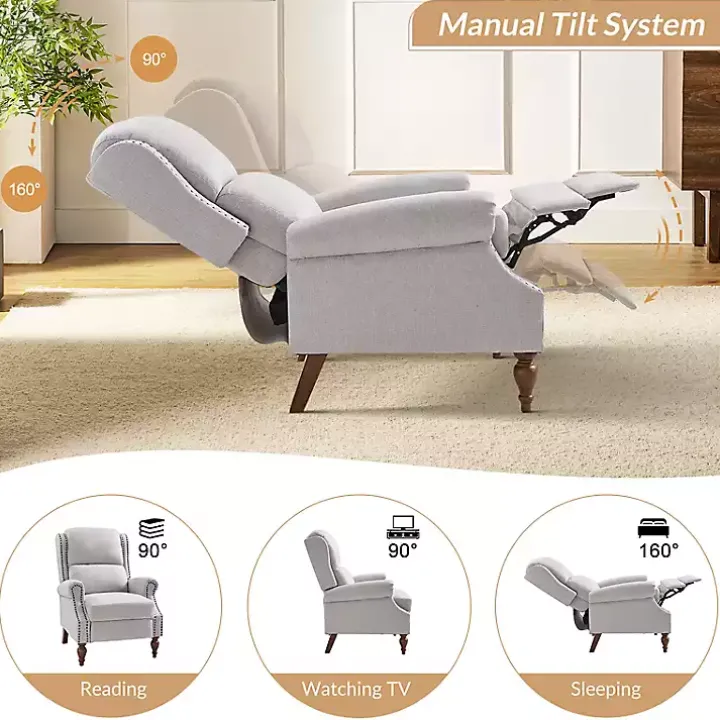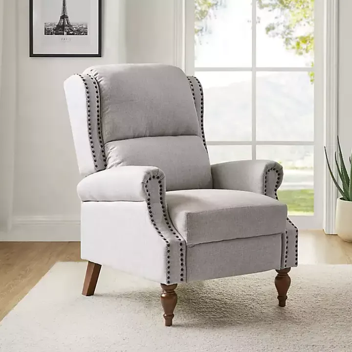 Accent your space with an elegant touch! This Rosalie Oatmeal Upholstered Manual Recliner features classic details like rolled armrests, nailhead trim, and spindle wood legs, so you can lay back and relax without sacrificing style.
