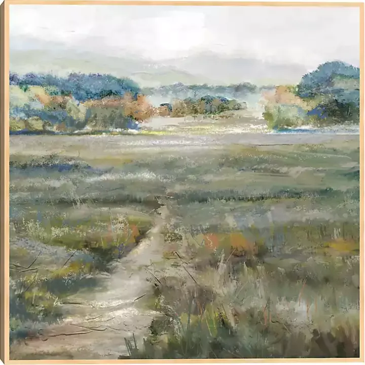 Gaze into the wide open spaces depicted in this Spring Mountains Framed Canvas Art Print. Grassy greens and blues will add a natural beauty to any wall!