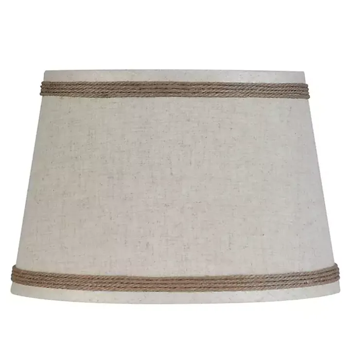 - Hardback tapered oval shade in an oatmeal linen color with brown rope borders