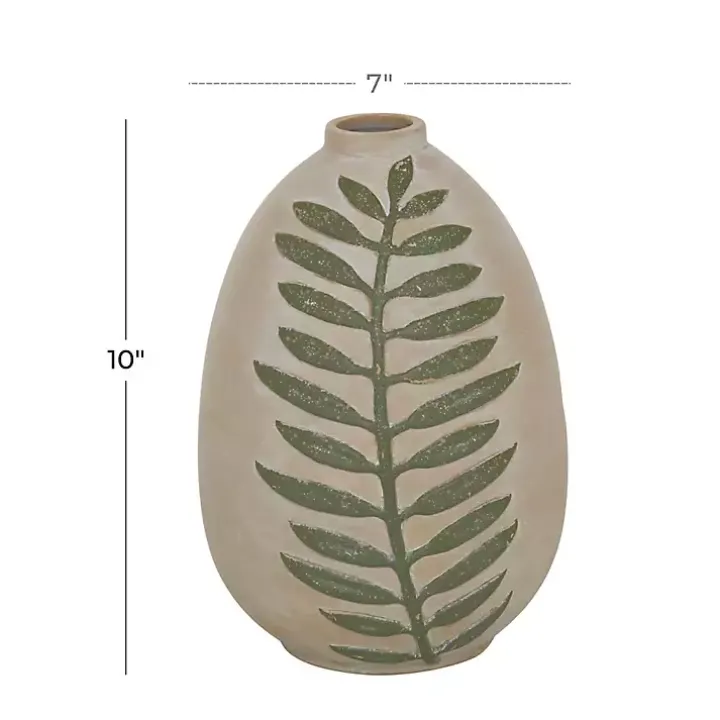 The Tan Raised Green Fern Ceramic Vase features a raised green fern on an earthy, tan background. Add a single flower stem to create a minimal statement piece.