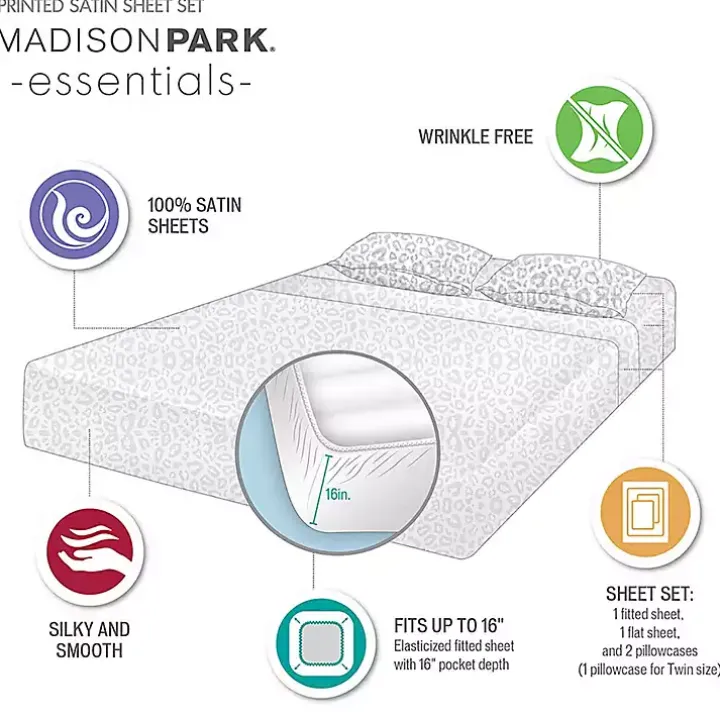 Treat yourself and your bedroom with the elegance of our Taupe Leopard Print Satin 4-pc. King Sheet Set. These luxury, wrinkle-free satin sheets are silky smooth to the touch and feature a glamorous animal print that elevates the style and comfort of your bed.