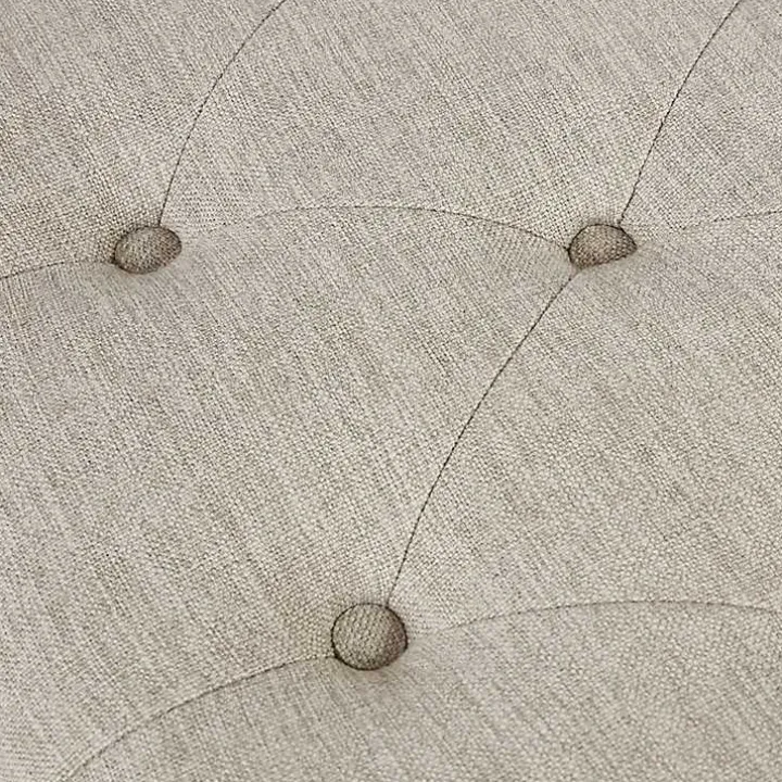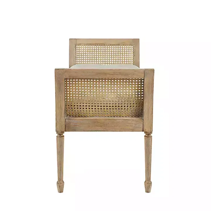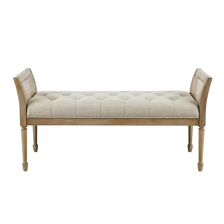 Taking inspiration from her farm in upstate New York, Martha Stewart’s Isla Bench features a tufted upholstered seat and cane insets in the track arms, complementing neutral color palette for year-round beauty.