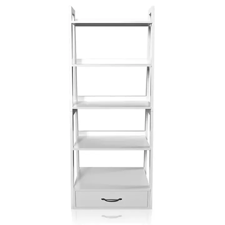 Display your favorite reads, mementos, and other decor with this White Wood 5-Shelf Leaning Bookshelf. With a sleek, elevated design and lower drawer, this piece brings style and storage to any space!