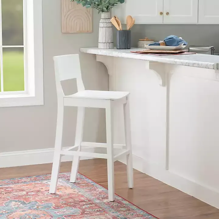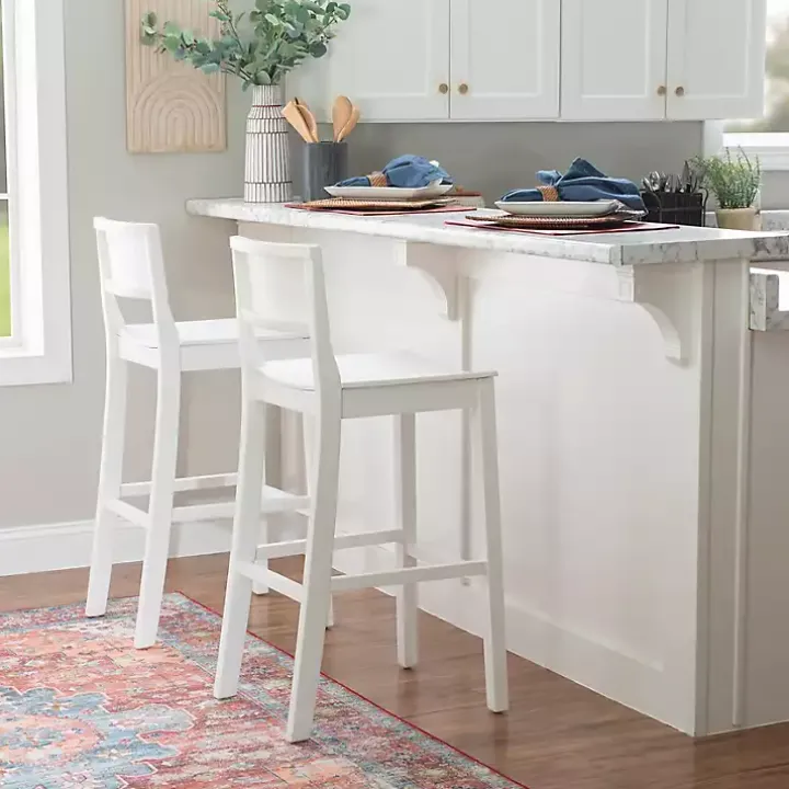 With their simple, classic design, these White Wood Devin Bar Stools will easily complement your decor while also refreshing your space. Give your kitchen an inviting look with this charming set!