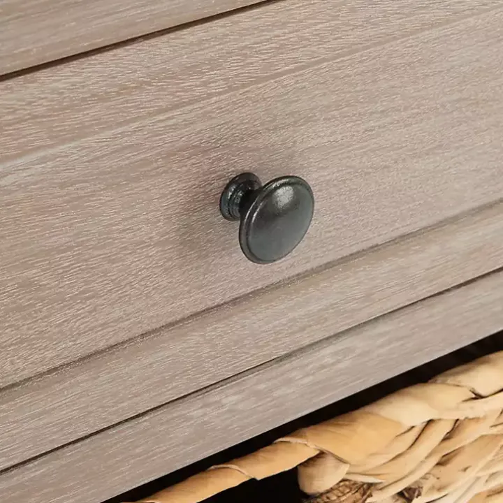 - Features one (1) drawer, two (2) shelves, and two (2) woven baskets