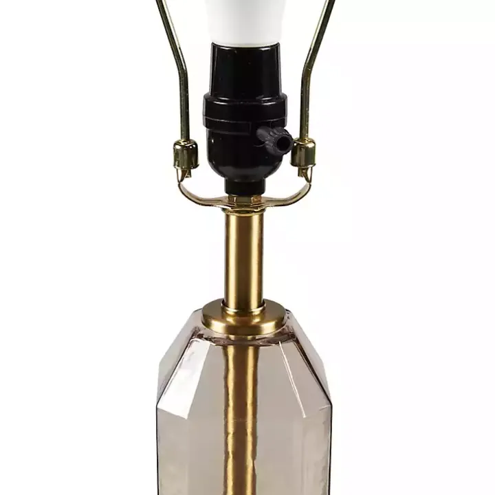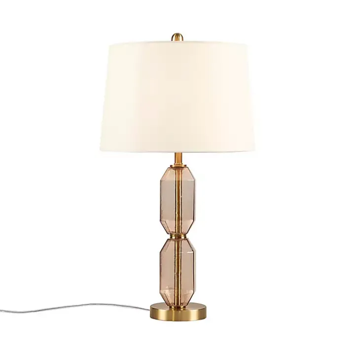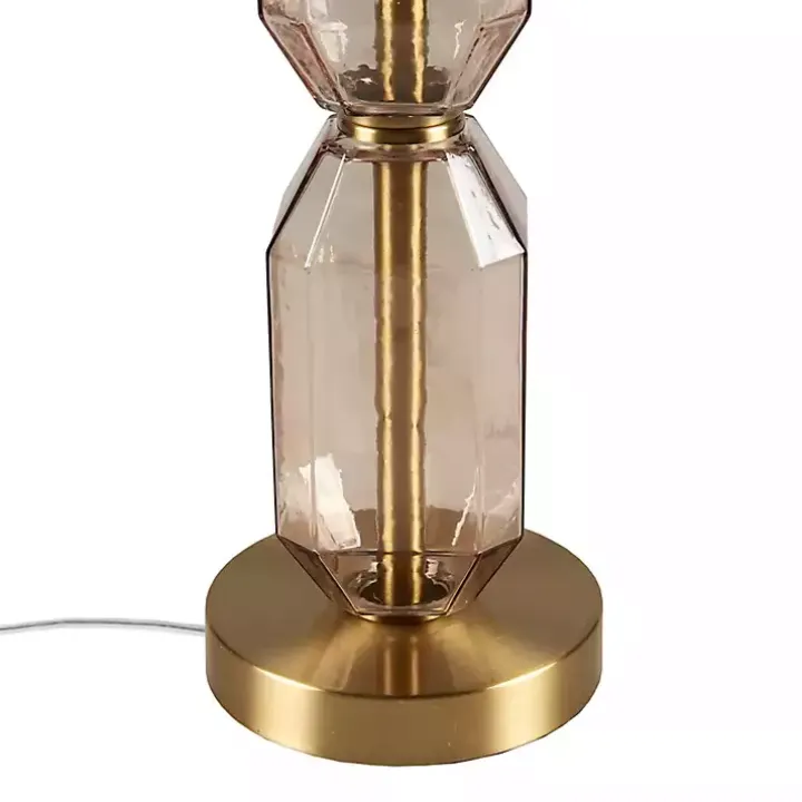 The Amber Faceted Glass Table Lamp combines elegance and contemporary allure. Crafted from brown colored glass with a faceted silhouette, it boasts an elegant white shade atop a gold metal base and finial, perfectly complementing the center rod for a cohesive look.