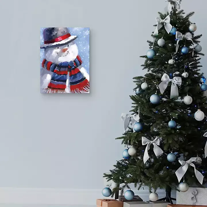 Wearing a scarf, hat, and a smile full of Christmas cheer, this Blue Jolly Snowman Canvas Art Print is sure to fill your space with a special holiday magic!
