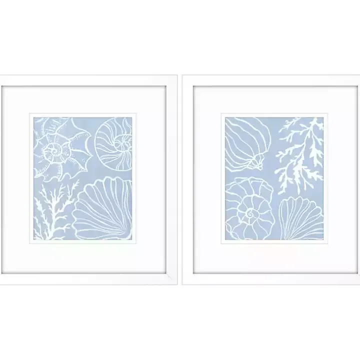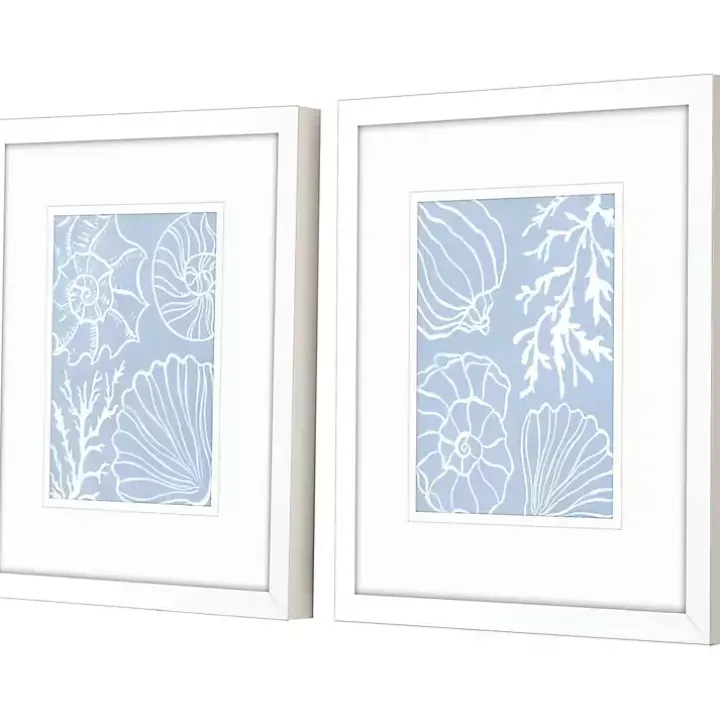 Bring some coastal treasures into your home with these Blue Shell Silhouettes Framed Art Prints. Their light blue color will beautifully complement any beach-themed decor!
