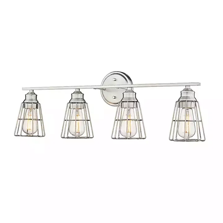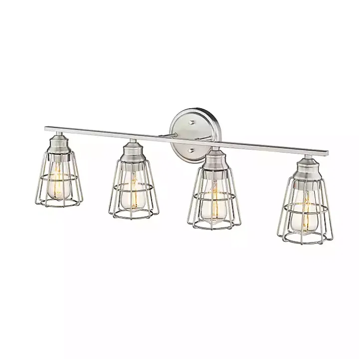 Elevate your bathroom style with a chic touch! Featuring open shades and a metallic finish, our Brushed Nickel Cage Shade Vanity Light is perfect for your modern farmhouse space.
