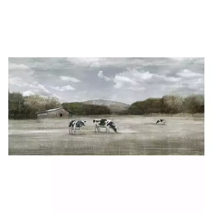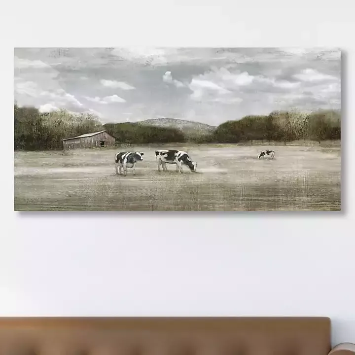 Our Country Satisfaction Giclee Canvas Art Print will accent your walls beautifully! The grazing cows and lush green grass make a lovely statement.