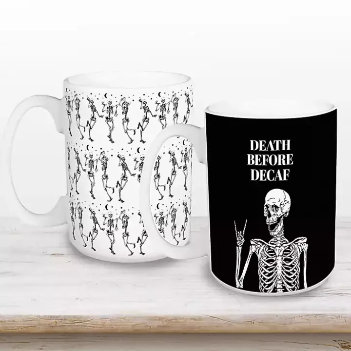 - Mug B features a black background with a skeleton and the words “death before decaf”