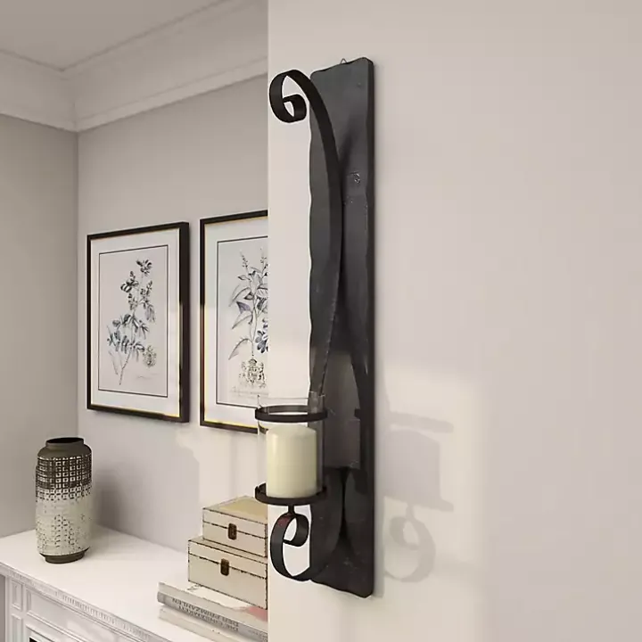 Add a soft light to your hallway, dining room, or entryway with this Distressed Black Scrolled Metal Sconce. Its rustic style will bring a cozy charm to any room!