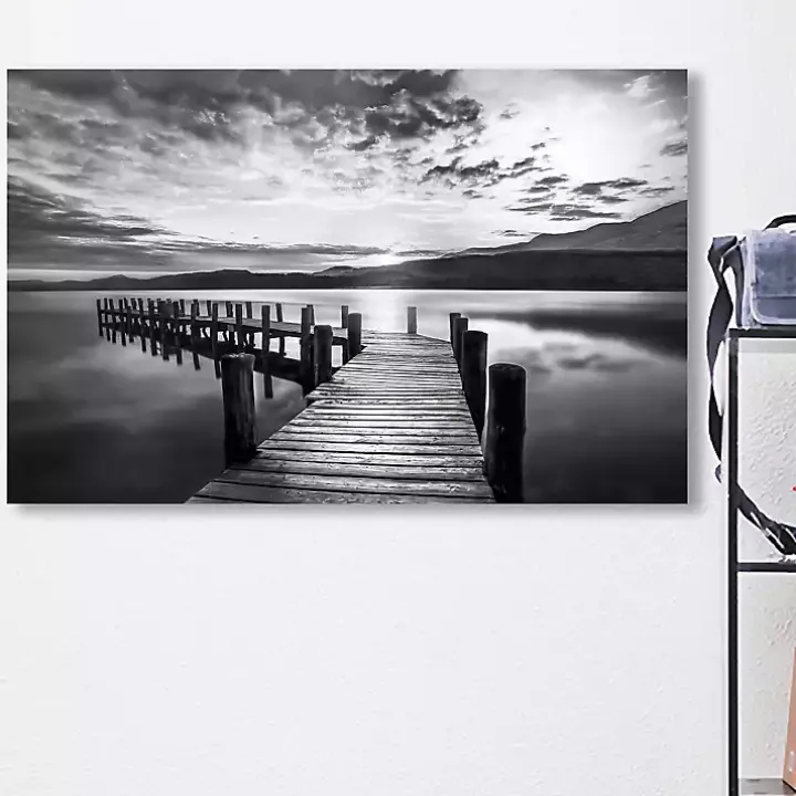 This black and white print of a dock will help complete any stylish home look. The Evening Dock Canvas Art Print is the perfect statement piece for lake houses, beach cottages, or any space you want to give a unique look.