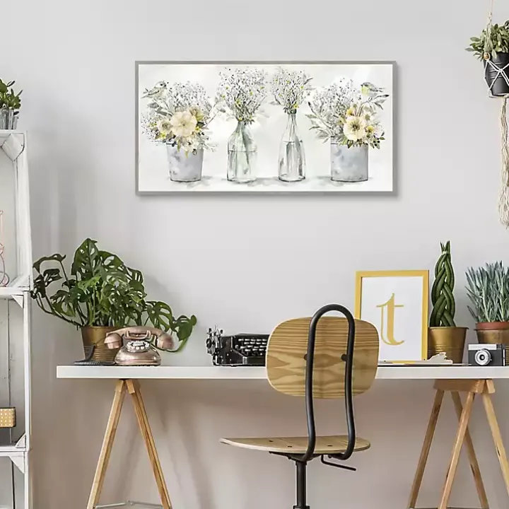The Farmhouse Bouquets Framed Canvas Art Print will look lovely in any rustic, country style setting. Featuring dainty yellow flowers and adorable chickadee designs, it enlivens any living space!