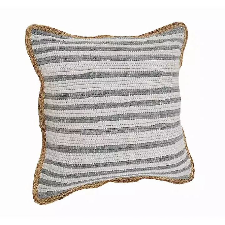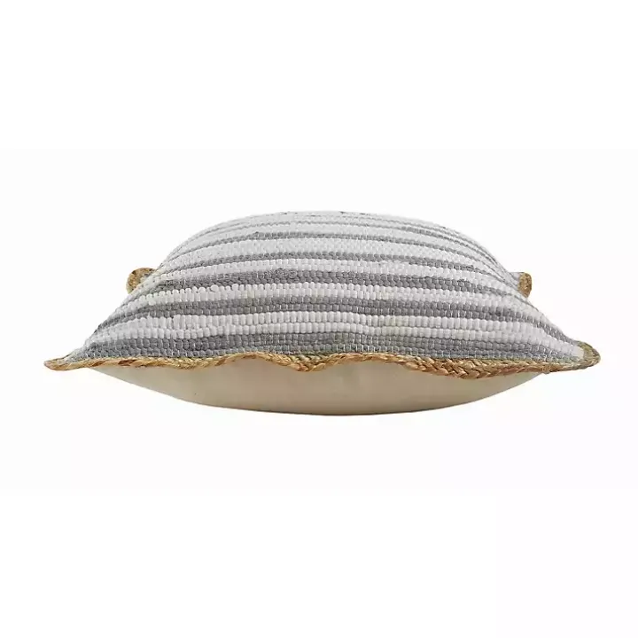 Add a classically cute look to your living space with this Gray and White Stripped Jute Border Accent Pillow. You’ll love its woven design and neutral color palette.