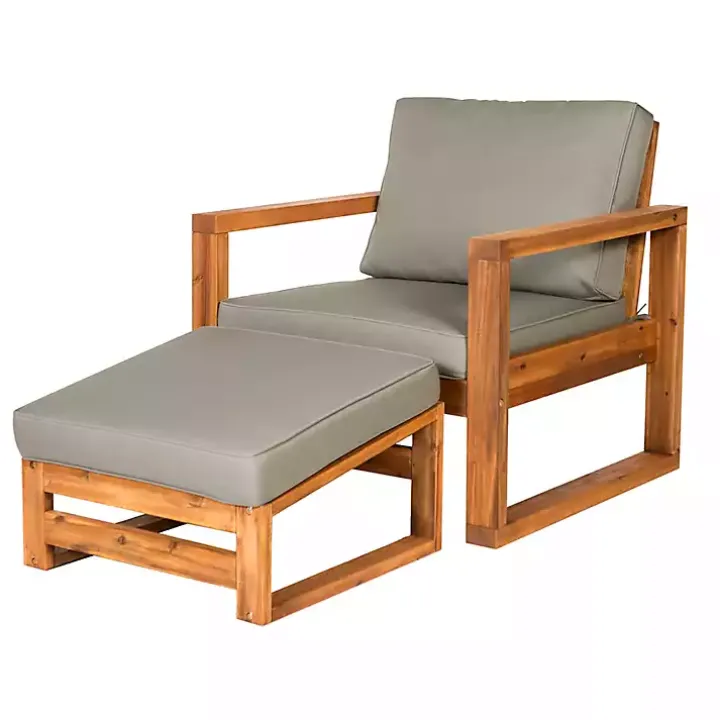 Enjoy your morning coffee and relaxing afternoons outside with this Gray and Wood 2-pc. Outdoor Chair and Ottoman Set. Its modern, understated design and comfy seating will help you make the most of your outdoor space!