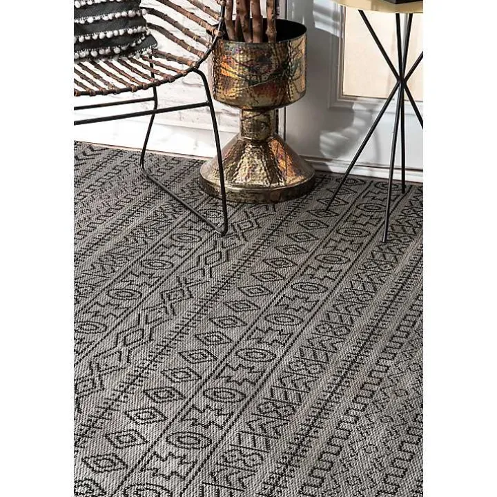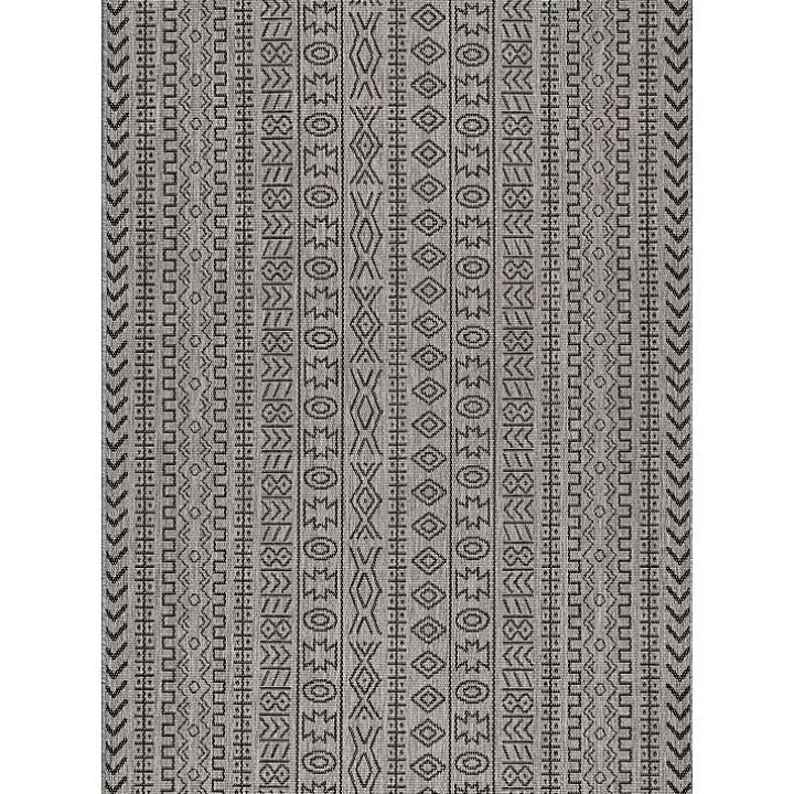 Our Gray Jamie Outdoor Area Rug will energize your outdoor space with its exotic, tribal motifs. Be sure to pair these deep gray hues with iron furnishings to create a sleek space for entertaining.