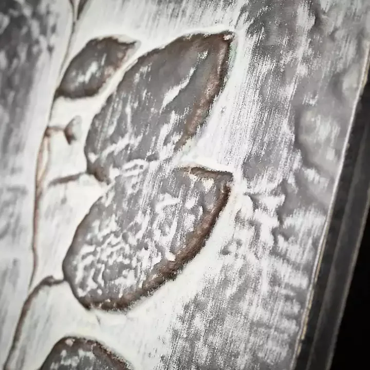 Detailed with distressed frames, embossed texture, and a washed finish, the set of Gray Metal Raised Leaf Wall Plaques brings botanical beauty and rustic appeal to any display!