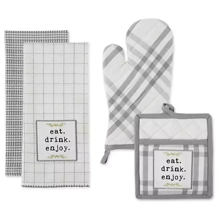 - Towel and potholder feature the phrase “eat. drink. enjoy.”