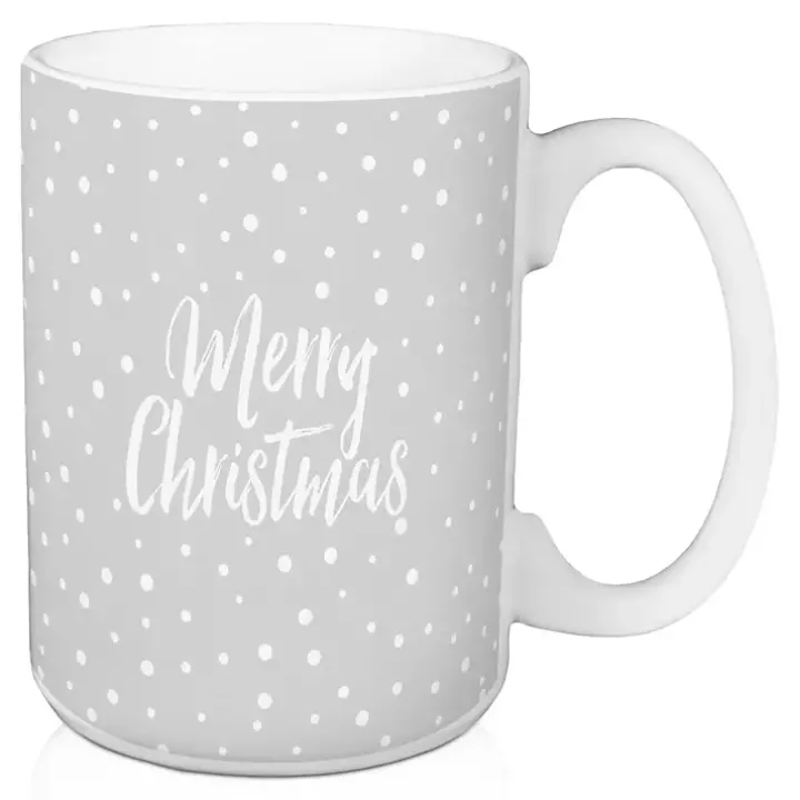 - Second mug features the words “Merry Christmas” and snow pattern in white on a gray background