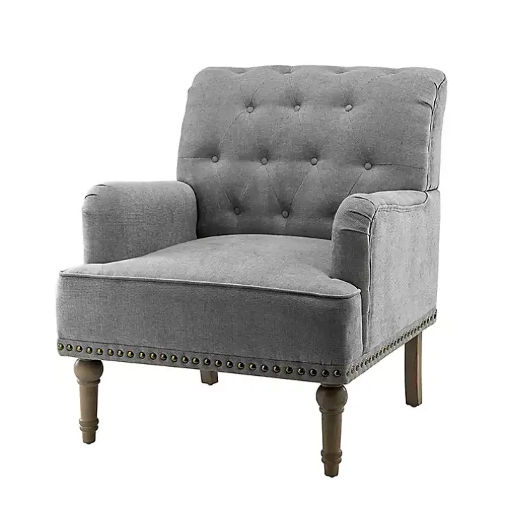 This Gray Tufted Britt Accent Chair will bring sophistication to any room in your home! With its tufted details, nailhead trim, and turned legs, you’ll love how this chair looks in your space.
