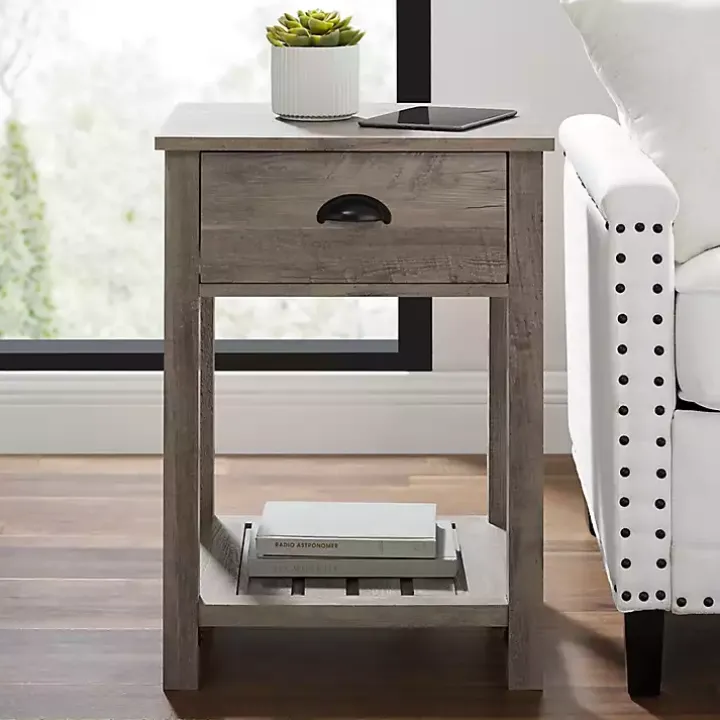 Whether you’re looking to keep things quaint and cozy or simply organize your home, this Gray Wash Country Accent Table will satisfy your design desires! The single top drawer with a cup handle features telescoping metal drawer glides for convenient closed storage. The lower slat-style shelf creates an open storage space while infusing farmhouse style. Use this accent table in the living room or home office for some sneaky storage. Pair with the matching entry table to make a complete set in your home!