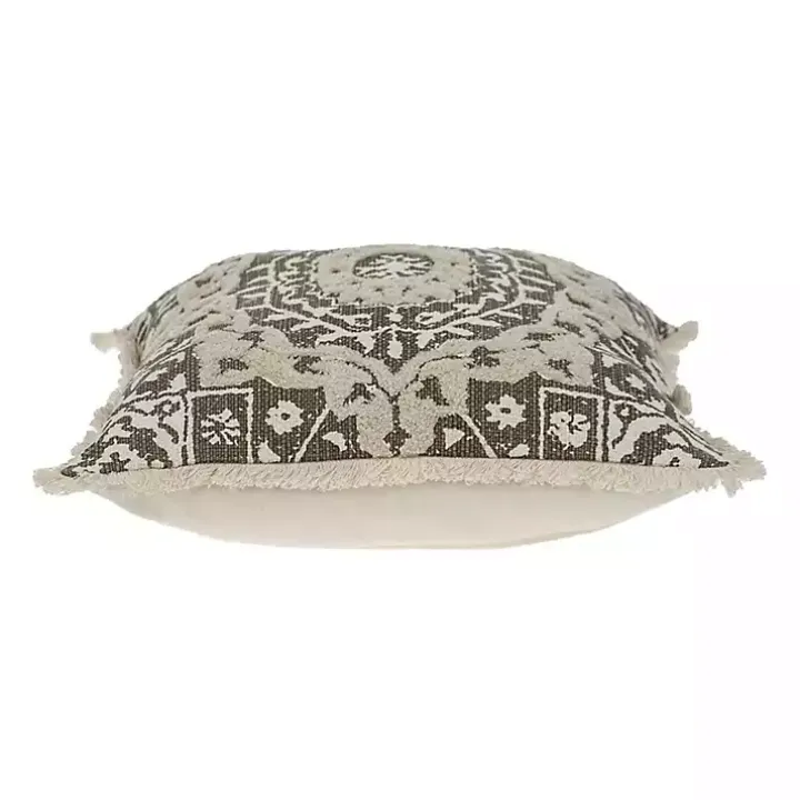 Embellish your sofa or bed design of this Green and Tan Medallion Fringe Pillow. Its ornate design and textured accents bring a timeless touch to any space!