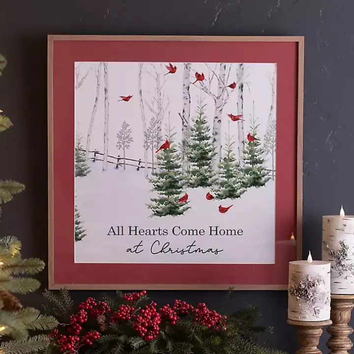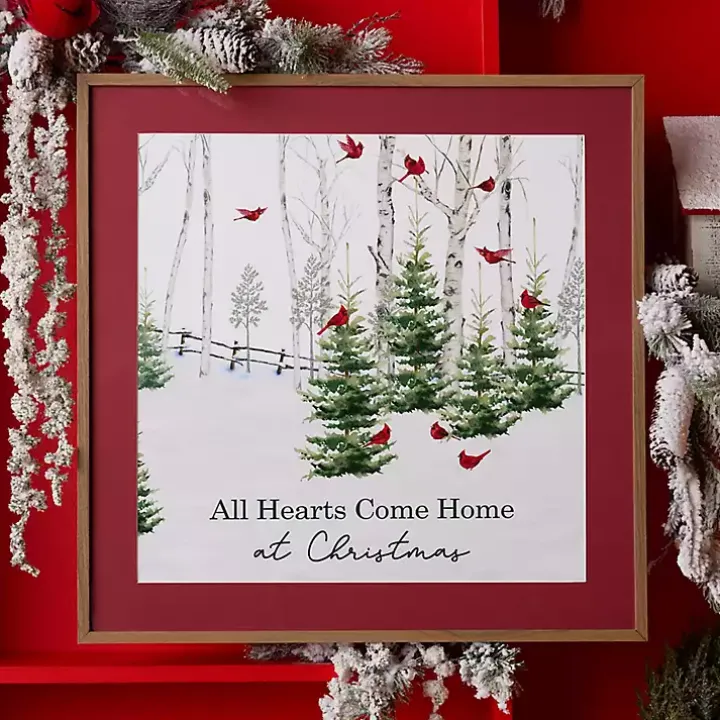 With red cardinals popping against a snowy white landscape, this Hearts Come Home at Christmas Framed Art Print will bring a cozy, holiday feeling to your home!