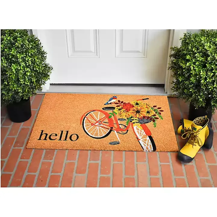 Perfect for summer, this Hello Floral Bicycle Doormat puts a bright, sunny touch on your porch. Its floral accents will give guests a beautiful welcome!