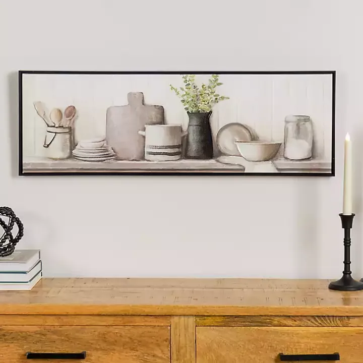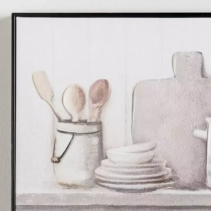 Bring some beauty to your kitchen walls with this Kitchen Counter Framed Canvas Art Print. Its soft, neutral tones will add a charming touch to any space!